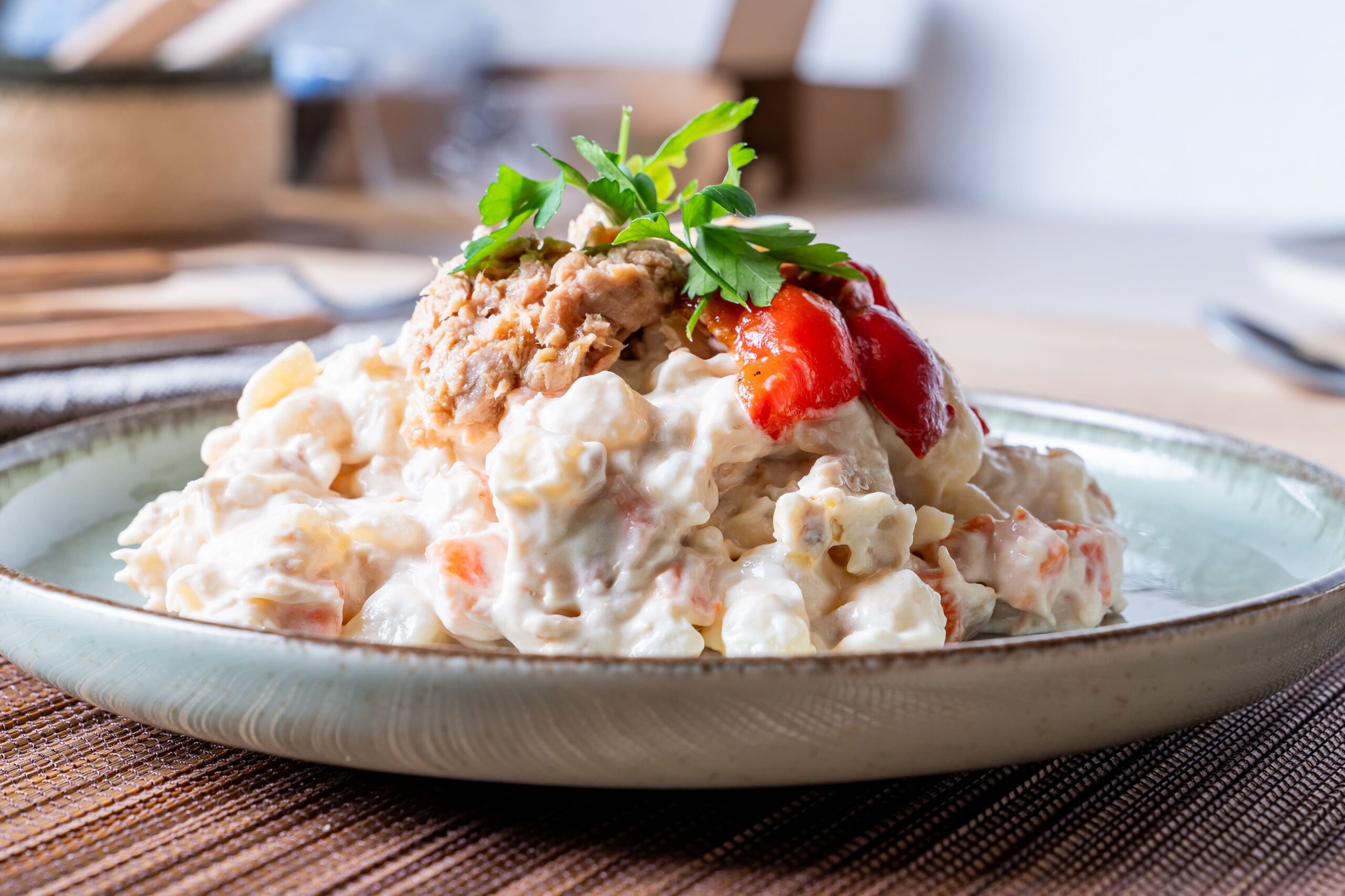 Patata, zanahoria, guisantes, atún y huevo cocido se combinan con una mayonesa suave para ofrecer un plato fresco, natural y lleno de sabor. Ideal para compartir en familia o disfrutar en cualquier ocasión.