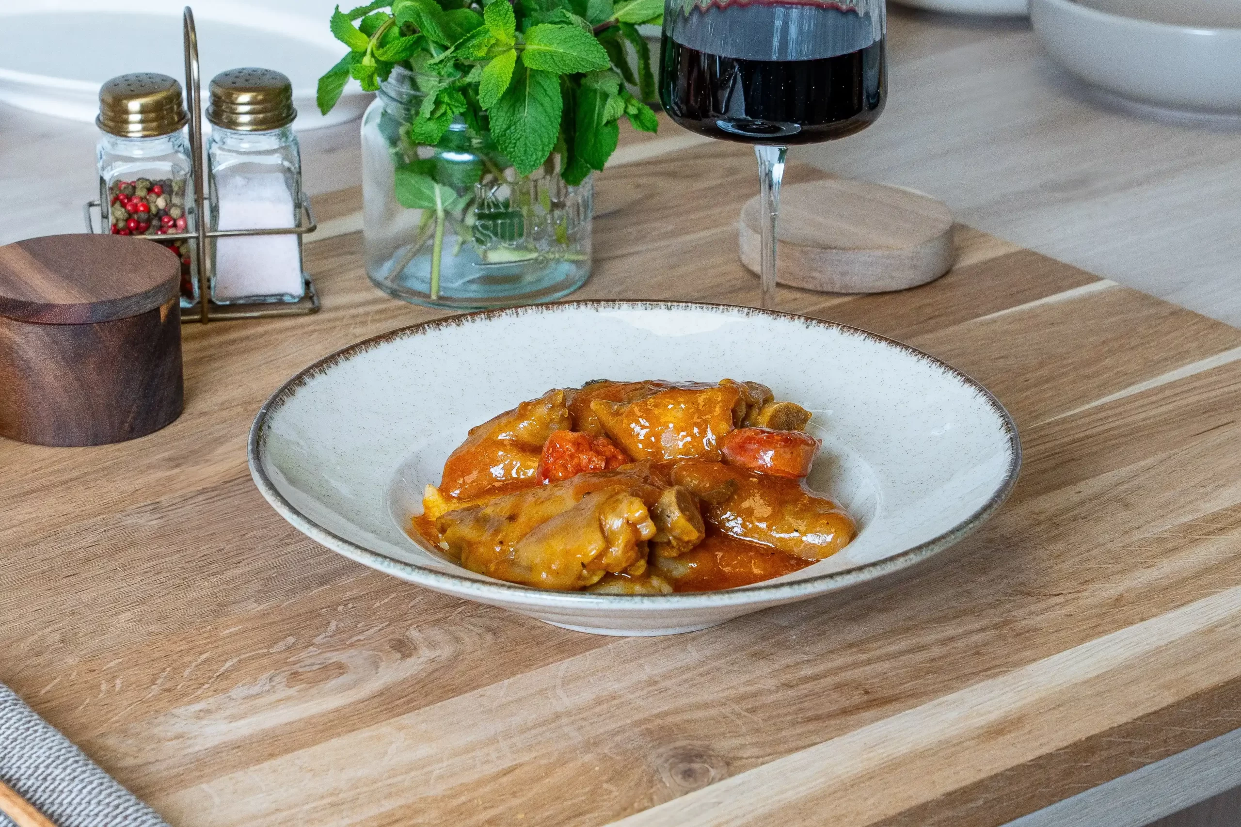Nuestras manitas de cerdo se cocinan lentamente hasta alcanzar una textura melosa y un sabor profundo, potenciado por el uso de AOVE ecológico Esencia Familiar y verduras frescas de proximidad.